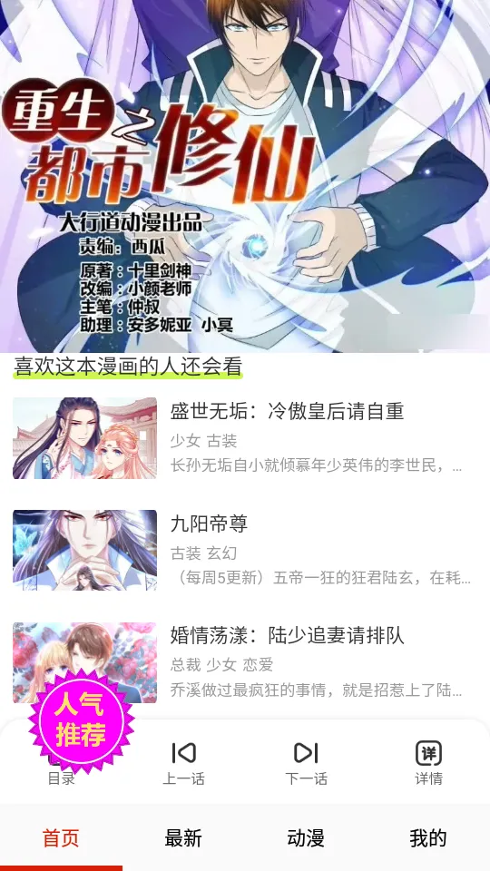 如果你喜欢看漫画,那皮皮喵lite漫画相关软件绝对是你的不二之选。这些软件功能超强大,能解决你追漫的各种需求。它们集成了多种漫画源,像皮皮喵汇集多种漫画类型,从热血玄幻到搞笑漫画,应有尽有,每日更新,让你不错过任何一集。还有独特的离线缓存功能,没网络也能畅快阅读。阅读模式丰富,可图文、文字自由切换,画面高清文字清晰。而且全平台支持弹幕互动,能和其他漫迷交流吐槽。简单的订阅设置,能快速找到感兴趣的漫画资源,还能依据偏好精准推送。像皮皮猫能提供超多不同平台独家漫画资源,分类精细,搜索功能强大。皮皮喵极速版漫画分类丰富,图片文字清晰度高,筛选、人气推荐、搜索功能都很便捷,能满足各类漫迷追漫需求,让你尽情享受漫画世界的精彩。