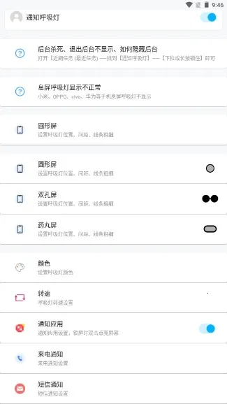 通知呼吸灯app可让异型屏通过呼吸灯提醒应用通知,涵盖来电、短信等。有强大通知提醒功能,支持个性化设置,兼容主流机型,还定时更新样式,操作简单,能满足多样需求。