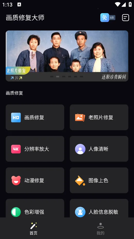 画质修复大师2026是专业手机修图工具,依托AI技术,可修复老旧模糊破损照片,为黑白照上色。简化修图操作,有教程,还能翻拍复原、颜色恢复,提供多种自拍处理工具,功能免费,操作简单易上手。