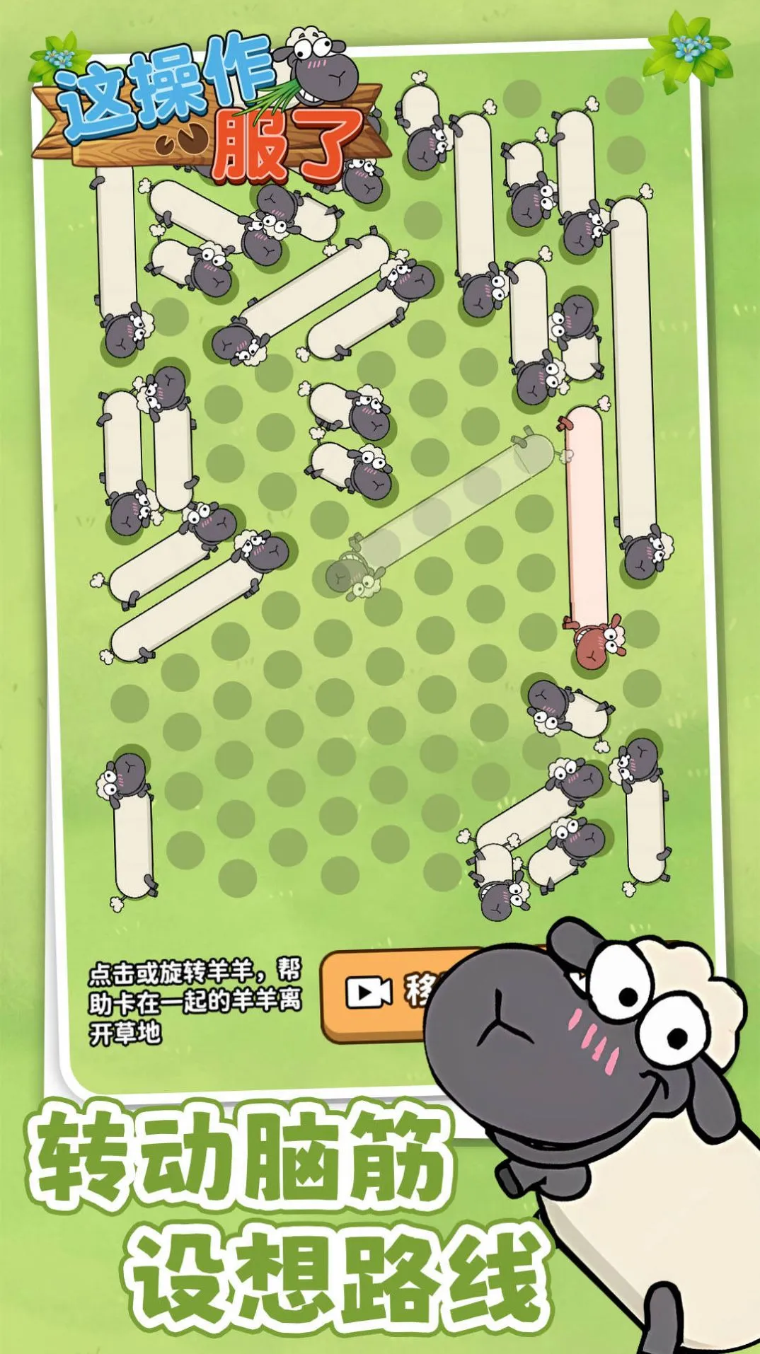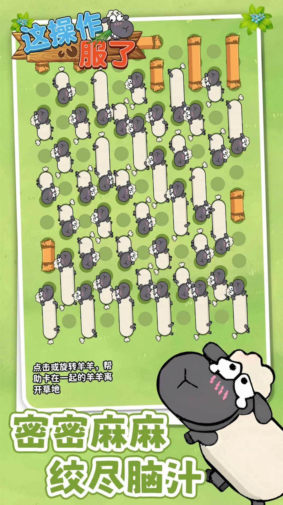 这操作服了是一款魔性休闲益智解压闯关游戏。玩家通过消除相同造型小羊解决卡羊问题助其离开草地,操作简单。有限制增加挑战,通关有道具,关卡设计合理,消除效果魔性,玩法轻松解压,难度适中易上手。