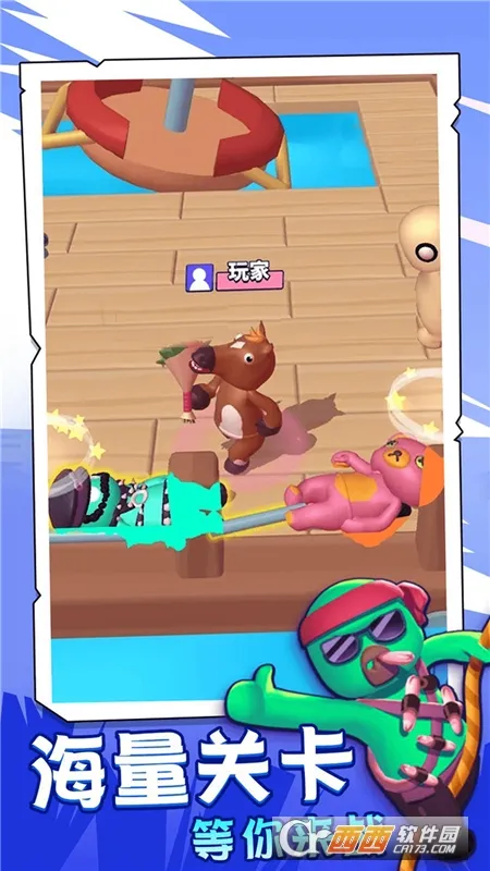 在玩法上,三键操作简单直接,零门槛就能开战。火器争夺环节很刺激,地图定时刷新高威力火器,抢先拿到就能逆转战局。在线乱斗也很棒,支持好友开房和全球匹配,跨区联机欢乐加倍。游戏里的对决特别魔性,小人夸张翻滚、搞怪尖叫,喜感十足。整体来说,它简单易上手又乐趣无穷,绝对值得一玩。
