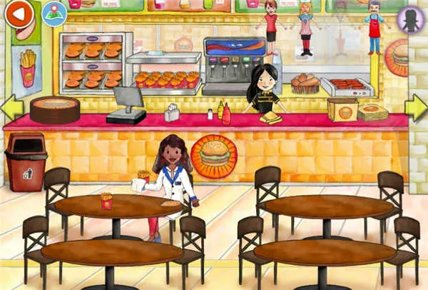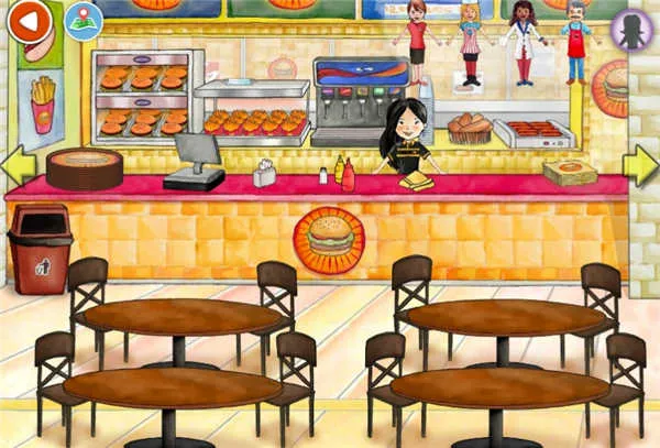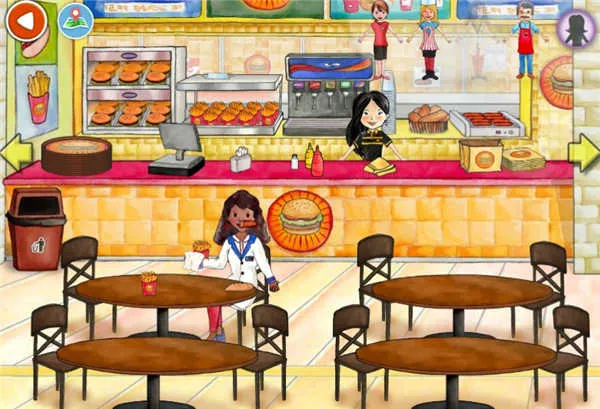 进入汉堡店等生活化商铺后,可自由组合食物:点击汉堡、薯条,再点番茄酱瓶为其添加酱料,完成一份专属餐点。