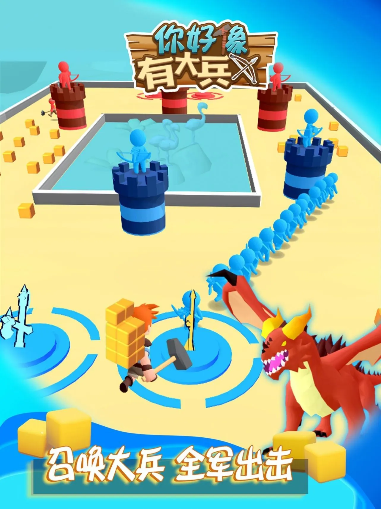 游戏有大量精心设计的关卡,可自由选择挑战。操作就是捡起地上方块变成小兵攻击对面的塔,小兵越多胜利越快。还能选择如步兵、弓兵、法师等不同角色,它们攻击、血量、移速各异,要根据关卡选合适的。你要不断挖矿获取资源召集士兵,探索地图占领区域找隐藏资源,也能自由召唤不同能力的宠物为你战斗。快来下载体验,用策略和技巧享受这场趣味战斗之旅,感受胜利的快感吧!