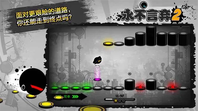 永不言弃2是一款音乐节奏闯关游戏,延续一键式操作。以黑白水墨风呈现,融合音乐与跳跃玩法。有18个全新关卡、多种难度,新增24个角色,可通过扭蛋收集。还能自定义关卡并分享,跟随音乐节拍操控小墨团躲避障碍闯关。