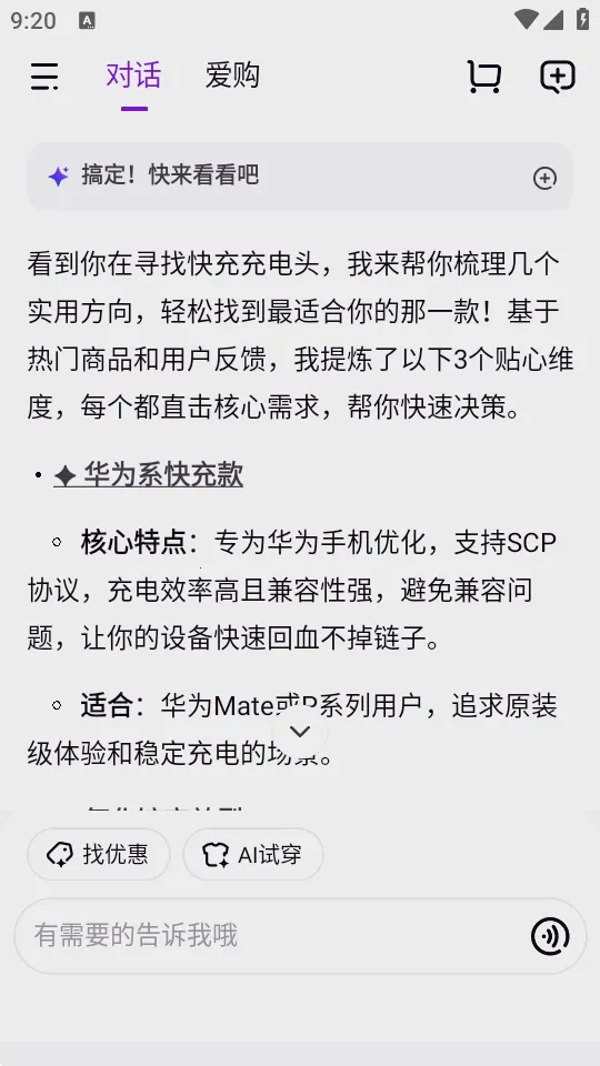 智能导购:告别关键词搜索,简单说出需求,就能召唤私人买手,精准匹配商品。
