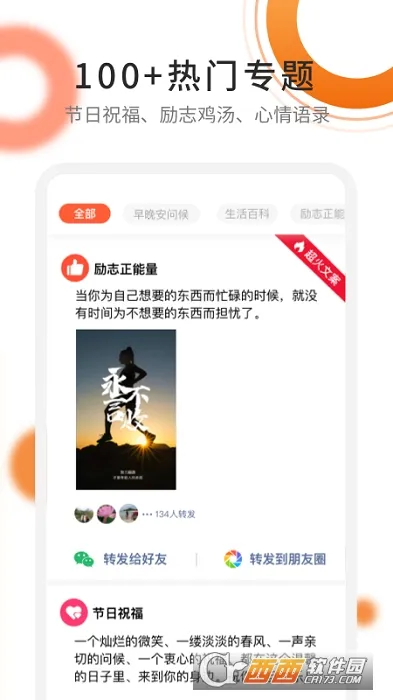 朋友圈文案精选,一款超棒的社交分享文案工具!它内置海量原创热门文案,涵盖节日、情感、励志等多主题。支持一键复制、分类检索、收藏管理与个性化编辑,能帮你轻松写出打动人心的朋友圈内容,提升社交表达力与互动率。
