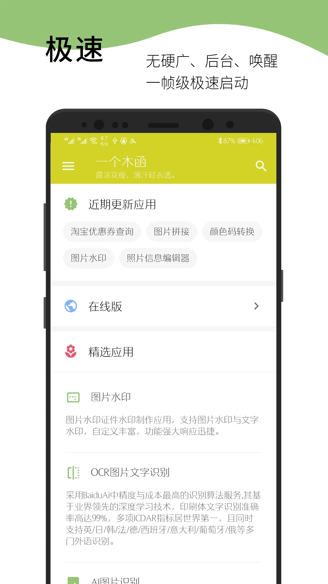 一个木函2026官方正版怎么样?它是一款备受瞩目的手机工具软件。这款软件以其小巧的体积和丰富的功能而闻名。在众多手机应用中,它宛如一颗璀璨的明珠。其功能涵盖了多个方面,无论是日常的图片处理、设备清理,还是文字转码等,都能轻松应对。它提供了与这些相关的80多种工具,基本能满足数码生活中的各种需求。拥有简明纯粹的主页与分类,没有多余信息干扰,让用户能专注于所需功能。在用户界面设计上紧跟潮流,执着到细节之处。从更新日志来看,它一直在不断优化和改进,修复各种问题,新增实用功能。如果你正在寻找一款功能强大且简洁易用的手机工具软件,那么一个木函2026官方正版**值得一试**。 它能为你的手机使用带来诸多便利,让你的数码生活更加轻松高效。