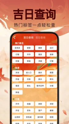 支持日期快速切换,可随时查询任意日期黄历吉日,精准筛选查询宜日忌日双模式,按热门吉日生活工商分类,上百种场景标签点击即筛。