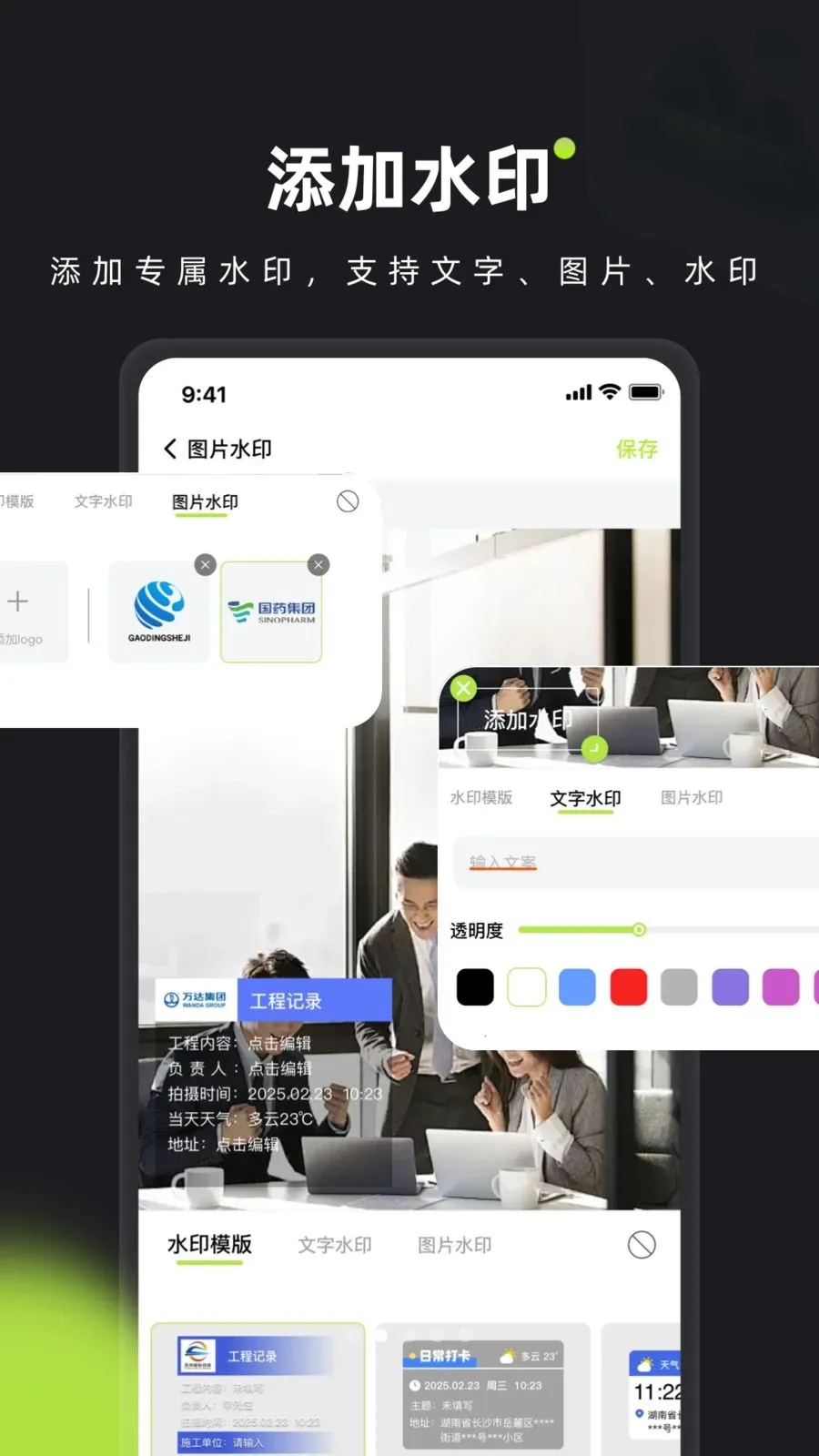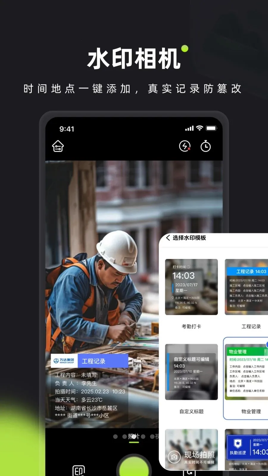 内置工程施工、外勤巡检、考勤打卡、现场记录等专业水印模板,一键套用超便捷。