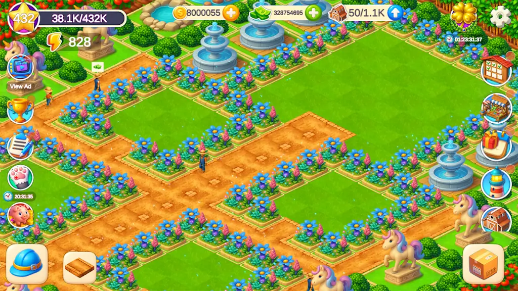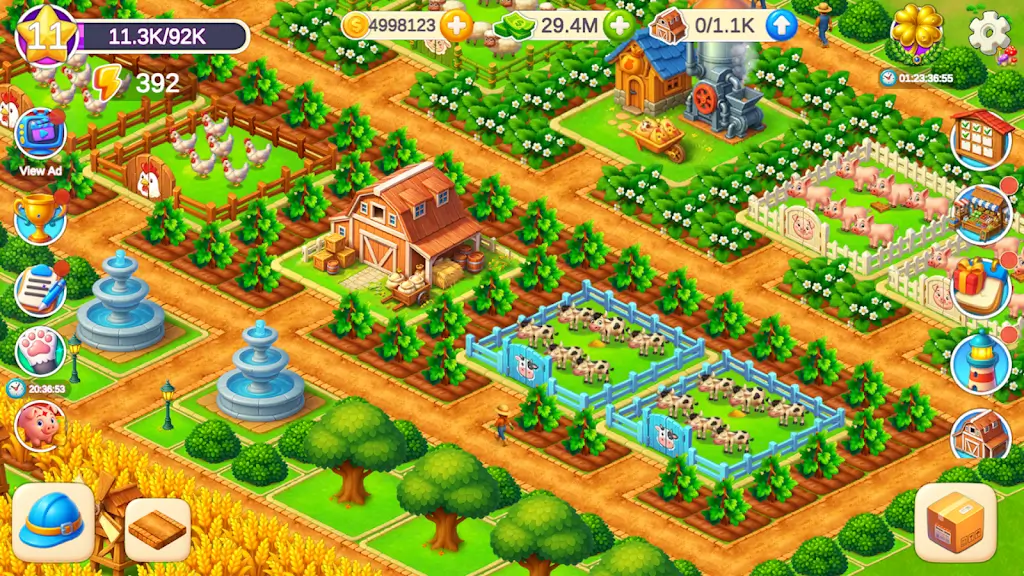 **个性化农场建设**:在这里,你能自由规划农场布局,随心选择不同风格建筑与装饰品,打造独属于你的个性化乡村农庄。从存放农具的谷仓到温馨小屋,再到装点环境的园林景观,皆可随意组合,美观又实用。随着游戏推进,更多高级建筑解锁,满足多样审美需求。