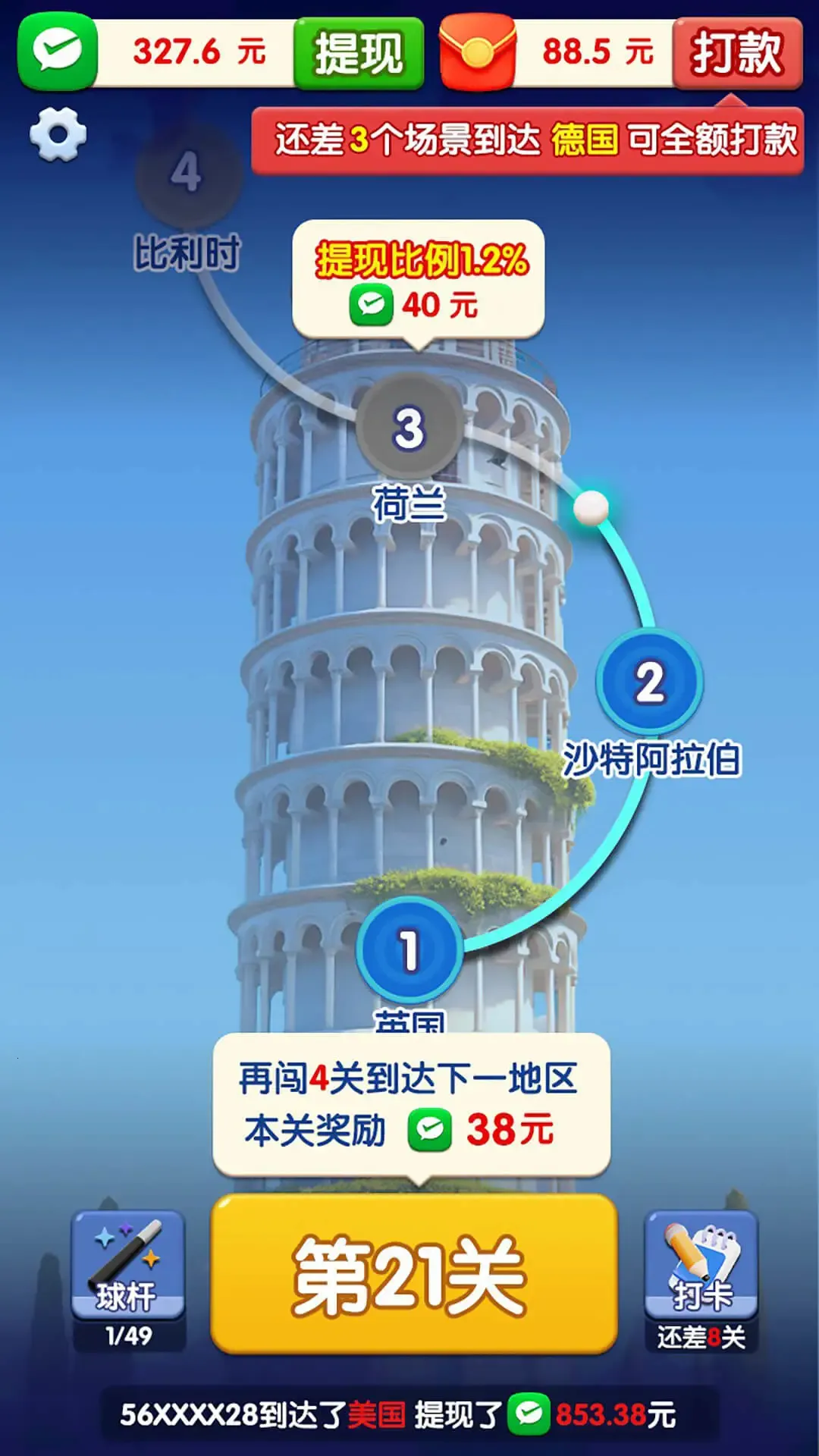 2、单人模式闯关升级,关卡越来越难,通过便可获得新的球杆皮肤,并带有独有音效。