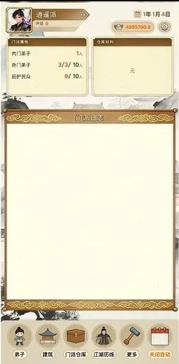 游戏中,管理银两流动、积累声望、培养弟子等环节紧密相连。合理规划资源流向与发展方向至关重要,这能让门派在江湖中站稳脚跟。招收不同弟子,见证他们修炼提升境界,为其配备神兵绝学,打造武林高手。十余种功能各异的建筑等待建造升级,构建完善的门派资源供给体系。